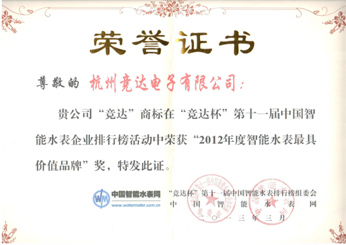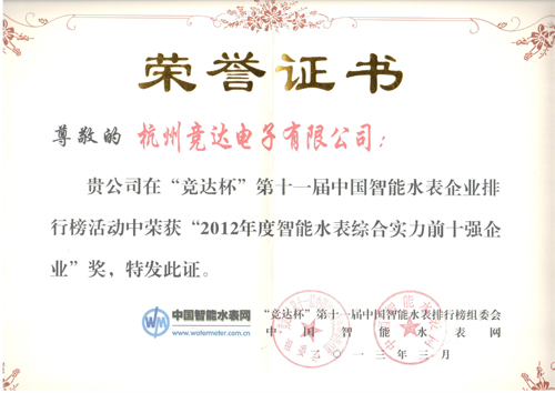 In the "11th China Smart Water Meter Enterprise Ranking" just unveiled last week, our company won three awards, namely "Top Ten Smart Water Meter Comprehensive Strength Enterprises in 2012", "Most Valuable Smart Water Meter Brand in 2012", and "Smart Water Meter Innovation and Excellence Enterprise in 2012". The leaders of the Ministry of Housing and Urban-Rural Development and the China National Institute of Metrology, Cao Shilai, Qu Fushun, and Li Xu, respectively awarded certificates to our company.